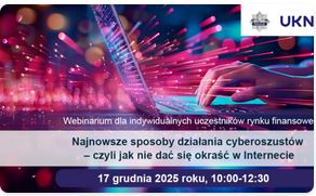 Urząd Komisji Nadzoru Finansowego zaprasza na webinarium (spotkanie online) „Najnowsze sposoby działania cyberoszustów – czyli jak nie dać się okraść w Internecie” organizowane w ramach projektu Centrum Edukacji dla Uczestników Rynku – CEDUR, we współpracy z Minister ds. Polityki Senioralnej oraz Komendą Główną Policji.