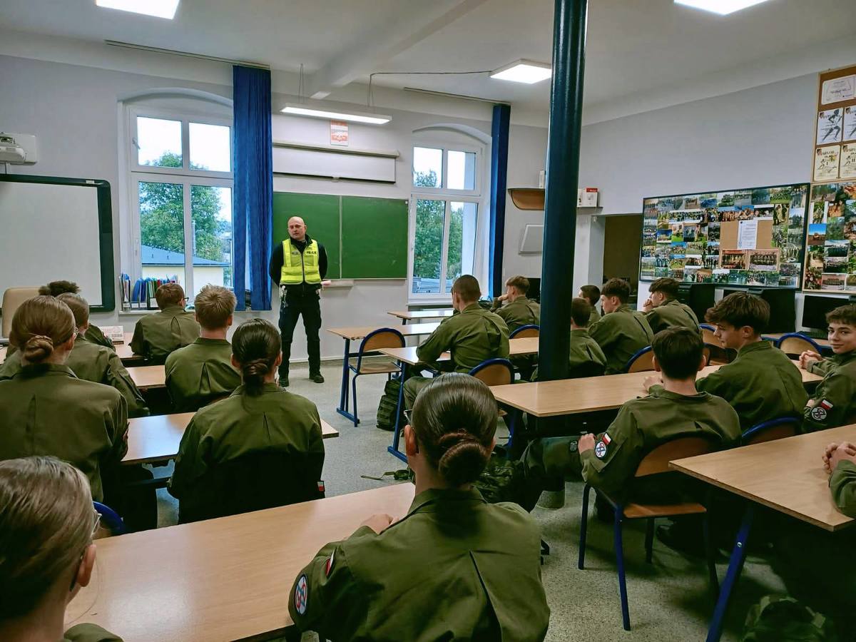 Kamiennogórski policjant Wydziału Ruchu Drogowego przeprowadził lekcję profilaktyczną w oddziale wojskowym ZSZiO w Kamiennej Górze aby uświadomić młodzieży najważniejsze zasady poruszania się po drogach.