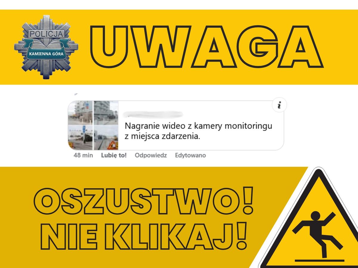 Co jakiś czas pod wstawianymi postami na różnych stronach pojawiają się komentarze, które wskazują na to, że istnieje nagranie ze zdarzenia. Niekiedy ciekawość może wygrać i będziecie chcieli kliknąć w link żeby spróbować je obejrzeć. Kamiennogórscy policjanci ostrzegają – to oszustwo przez które możecie stracić swoje dane do logowań, a także zainfekować wirusem swoje urządzenie!