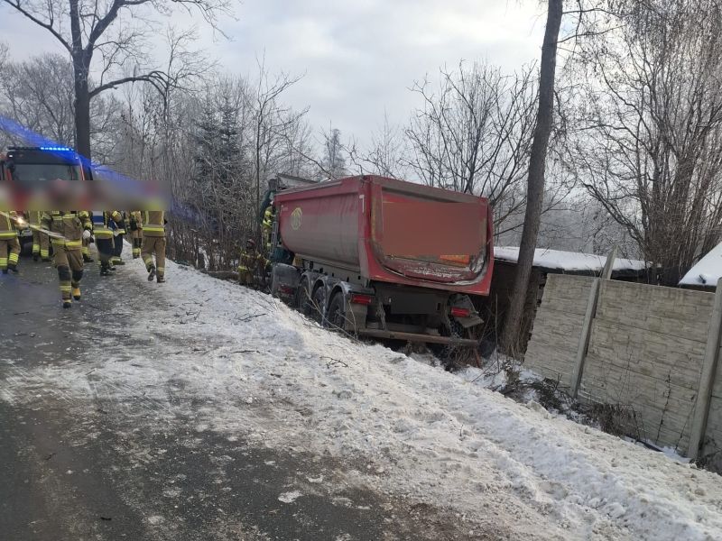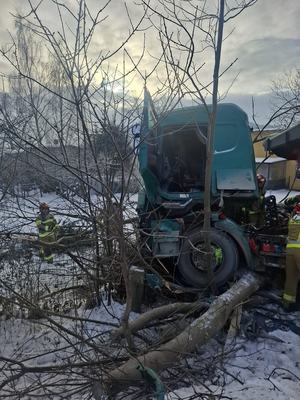 Ciężarówka uderzyła w drzewo i ogrodzenie